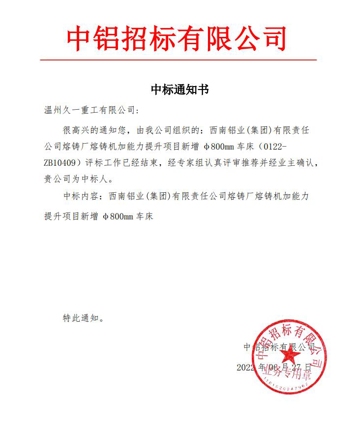 2022年6月27日,久一重工迎得喜訊,成功通過西南鋁業(集團)有限責任公司熔鑄廠熔鑄機加能力提升項目的專家組嚴格評審并中標。