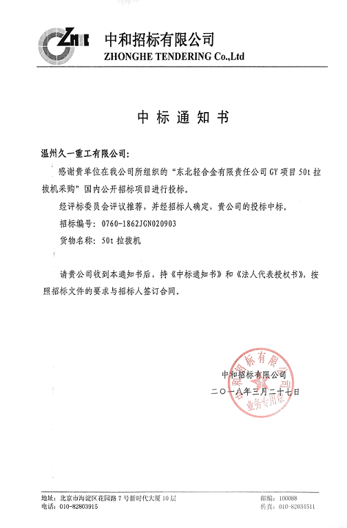 2018年3月27日,久一重工成功中標東北輕合金有限責任公司GY項目的50T拉拔機設備。50T懸臂式拉拔機是我公司針對高精度鋁合金管棒材進行研發,擁有多項知識產權的新型拉拔機。懸臂式拉拔機可以對表面質量要求特別高的管棒材進行有效拉拔,相比于傳統拉拔機,有著自動化程度高、生產效率高、成品率高等特點。