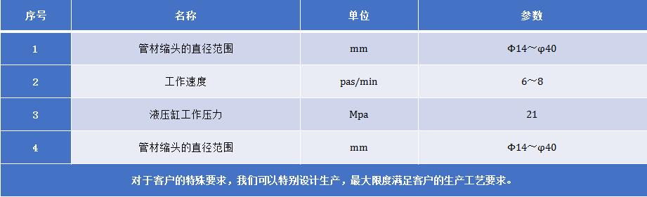 通過液壓缸帶動模具進退實現(xiàn)模具的張口與收縮,將工件放進料口模具內(nèi),通過模具的收縮擠壓實現(xiàn)縮頭。